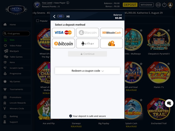Lincoln Casino accepts the following currencies: Bitcoin Cash, Bitcoin, Ethereum, Euro, Litecoin, US Dollars