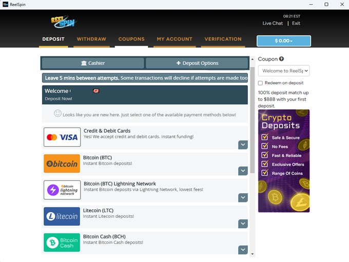 Reel Spin supports banking methods for deposits and withdrawals for Bank Wire Transfer, Maestro, MasterCard Credit, Visa Debit, Visa Electron, Visa Credit, Check/Cheque, Bitcoin, Litecoin, Bitcoin Cash, Tether, USD Coin, American Express, MasterCard Debit, Ethereum