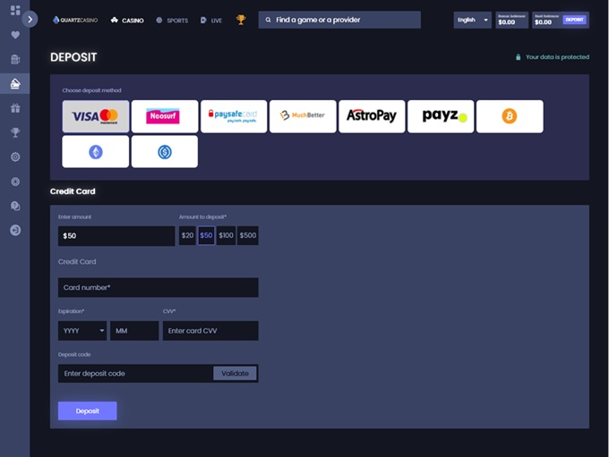 Quartz Casino supports banking methods for deposits and withdrawals for Diners Club Credit, Discover, Maestro, Visa Credit, Visa Debit, Visa Electron, MasterCard Credit, WebMoney, Bitcoin, Litecoin, Ethereum, Bitcoin Cash, Ripple, TRON, Dash, PayPal, MasterCard Debit, Bank Wire Transfer, Apple Pay