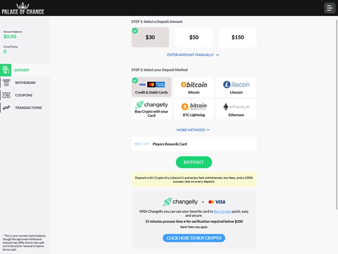 Palace of Chance supports banking methods for deposits and withdrawals for American Express, MasterCard Credit, Visa Credit, Bitcoin, Bank Wire Transfer, Check/Cheque, Discover, Players Rewards Card, Litecoin, Tether, Ethereum, MasterCard Debit