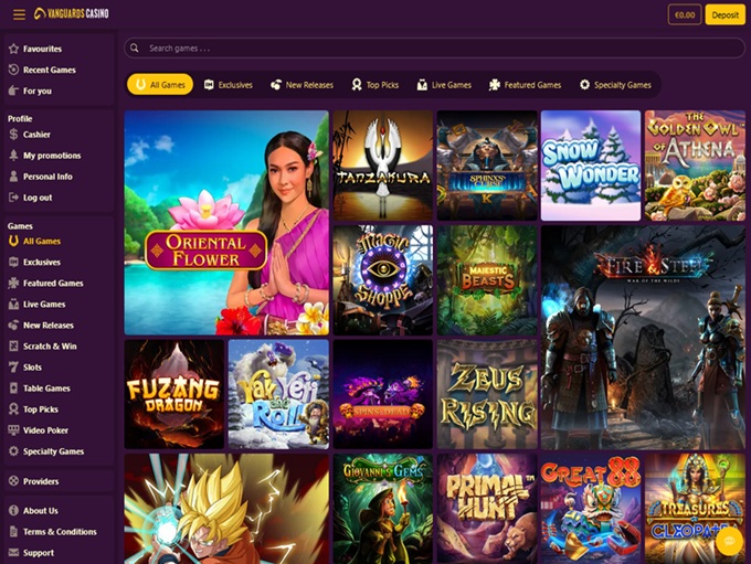 Vanguard Casino accepts the following currencies: AU Dollars, Bitcoin Cash, Bitcoin, Ethereum, Euro, Litecoin, Tron, US Dollars, USD Coin, Tether, South African Rand