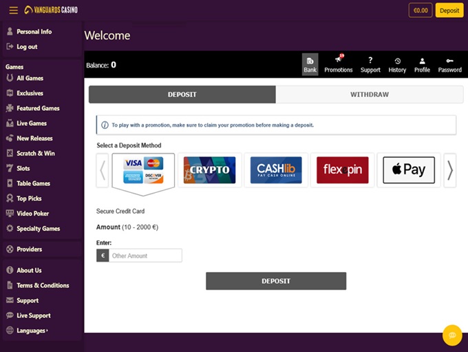 Vanguard Casino supports banking methods for deposits and withdrawals for MasterCard Credit, Visa Credit, Bank Wire Transfer, Bitcoin, American Express, Discover, Litecoin, Ethereum, Bitcoin Cash, Tether, USD Coin, TRON, Apple Pay