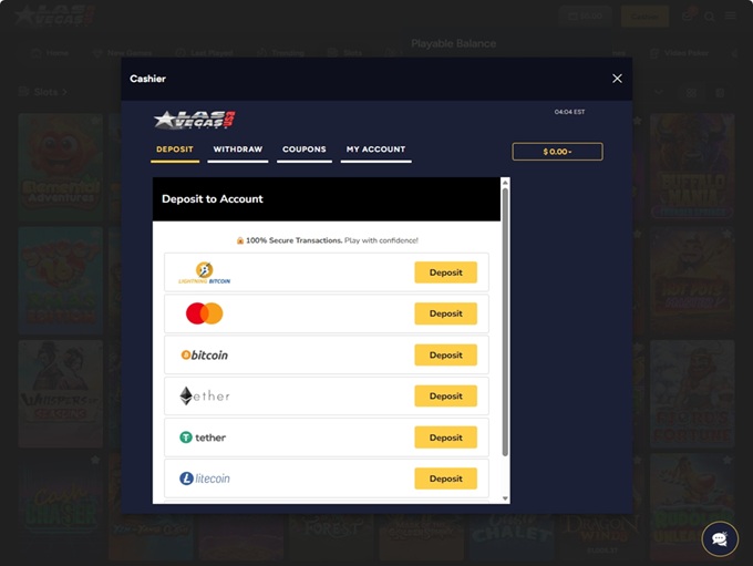 Las Vegas USA Casino supports banking methods for deposits and withdrawals for American Express, MasterCard Credit, Visa Credit, Check/Cheque, Bank Wire Transfer, MST Gift Card, Bitcoin, Discover, Litecoin, Ethereum, Tether, MasterCard Debit, Zelle, TRON