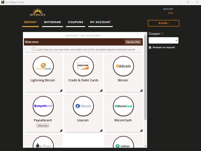 Sun Palace Casino supports banking methods for deposits and withdrawals for American Express, MasterCard Credit, Visa Credit, Bitcoin, Check by Mail, Bank Wire Transfer, MST Gift Card, Litecoin, Ethereum, Tether, Discover, MasterCard Debit, Zelle